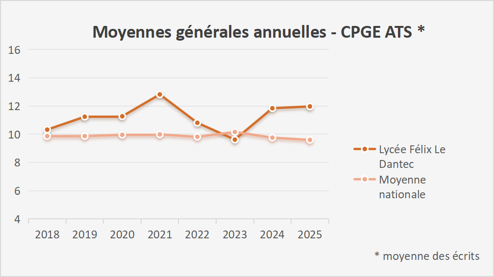 Vous trouverez ci-dessous un graphique présentant l'évolution des moyennes de nos étudiants aux épreuves écrites comparées aux moyennes nationales, c'est-à-dire à la moyenne de tous les étudiants de CPGE ATS de France.